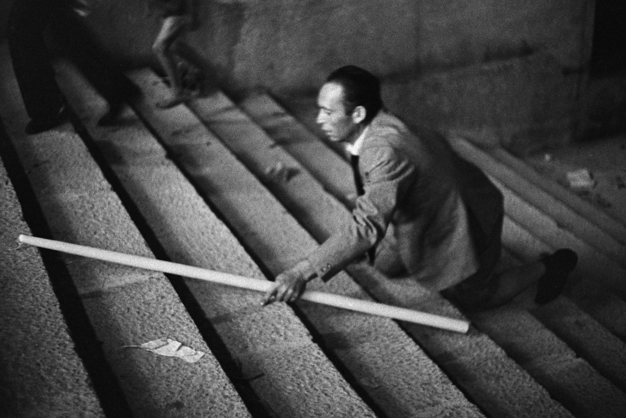 In contrast, the pilgrim crawling up the steps towards Santa Rosalia’s sanctuary in Scianna’s 1963 image, in gratitude or to seek divine assistance, is wilfully submissive. Likewise, those genuflecting at Lourdes are kneeling to a higher celestial presence, unseen by the camera. In Marseilles, 1978, Scianna frames an immigrant toiling while stone gods luxuriate in the background, impervious to prayers or passers-by. And yet we see a tendency in Scianna’s photographs for people to casually subvert expectations. Stairs become places to rest, congregate jovially and anarchically or play. They can become vantage points, places of aesthetic wonder or even everyday surrealism.
