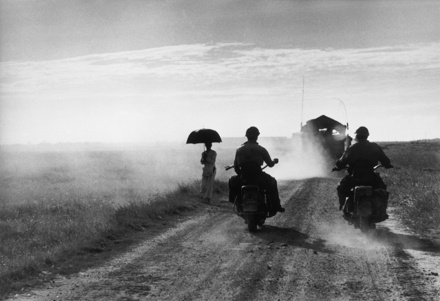 Motorcyclists and woman walking on the road from Nam Dinh to Thai Binh. Indochina, Vietnam. May, 1954.