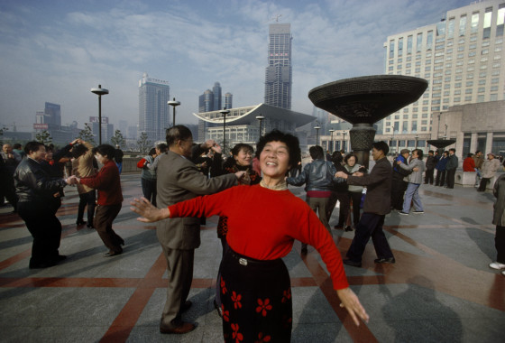 Harry Gruyaert Early morning dancing on People's Square with the new Opera house designed by French architect Jean-Marie Charpentier. Shanghai, China. 1999. © Harry Gruyaert | Magnum Photos