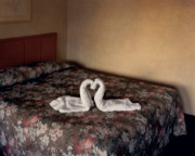 Symbols of romance recur through all the motels but they seem fraudulent and shallow. The heart-shaped bath (and is that Soth we see in the mirror there?) and towels folded into kissing swans are overwhelmed by the brutality of the everyday – cracked tarmac, empty car parks and grey skies that hint at what lies beneath the surface of our transitory passion.