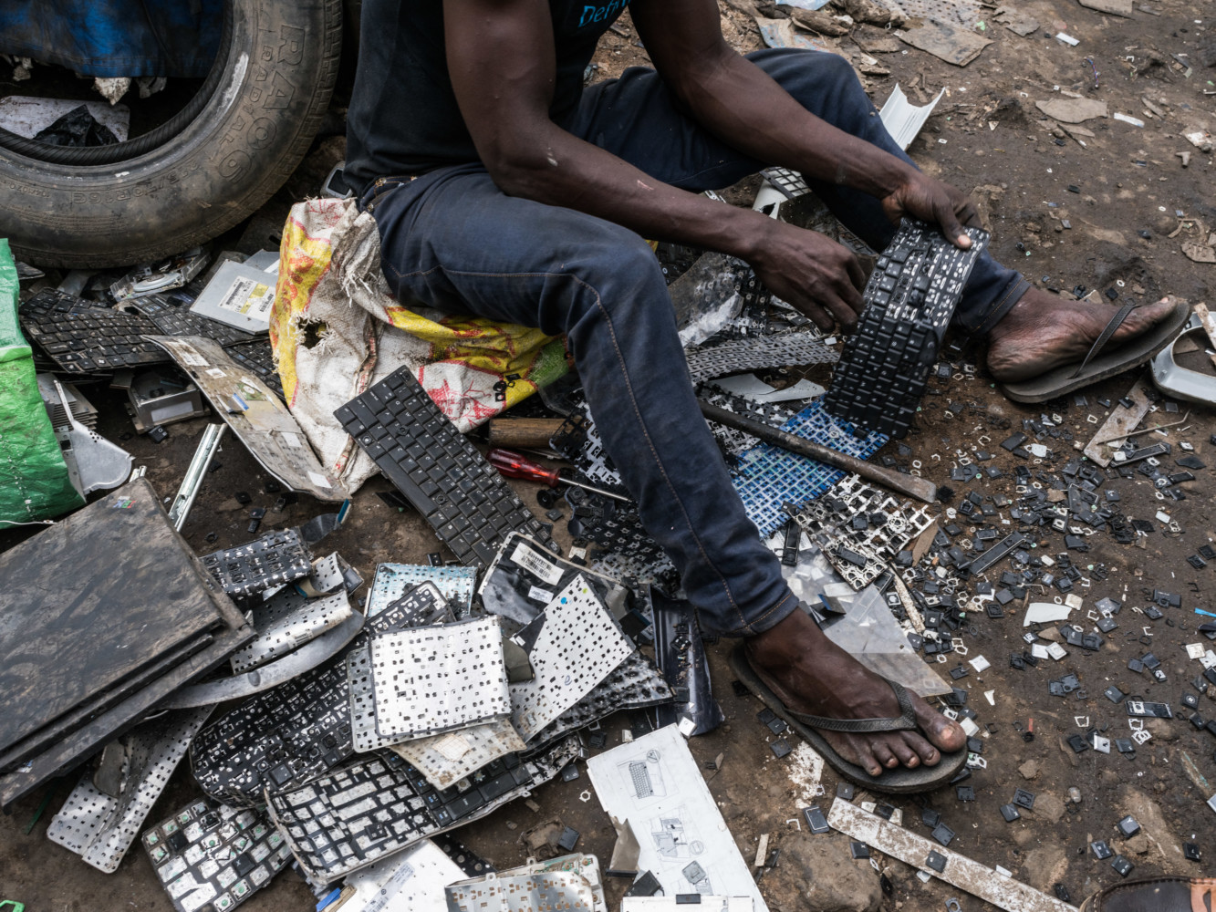 Carl De Keyzer A Nigerian migrant worker extracting the silver from the contact lining of a computer keyboard at the Agbogbloshie e-waste dumpsite in Accra. Agbogbloshie, Accra, Ghana. 2016. © Carl De Keyzer | Magnum Photos