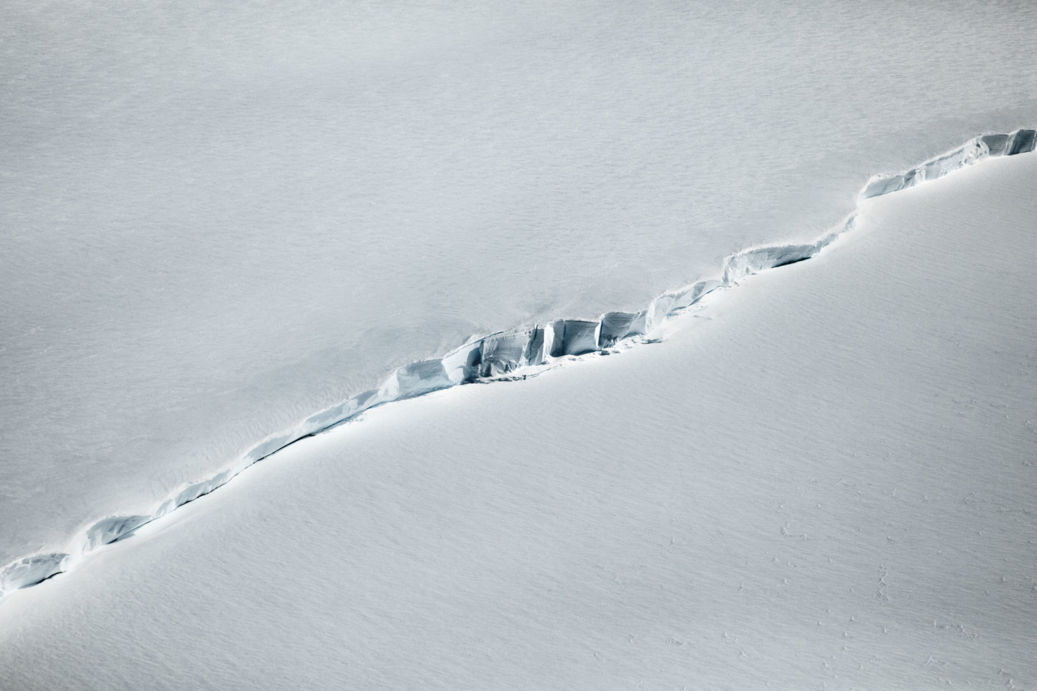 A crevasse measuring a few thousand feet from an altitude of 1,500 ft., during a November flyover. Antartica. 2017.