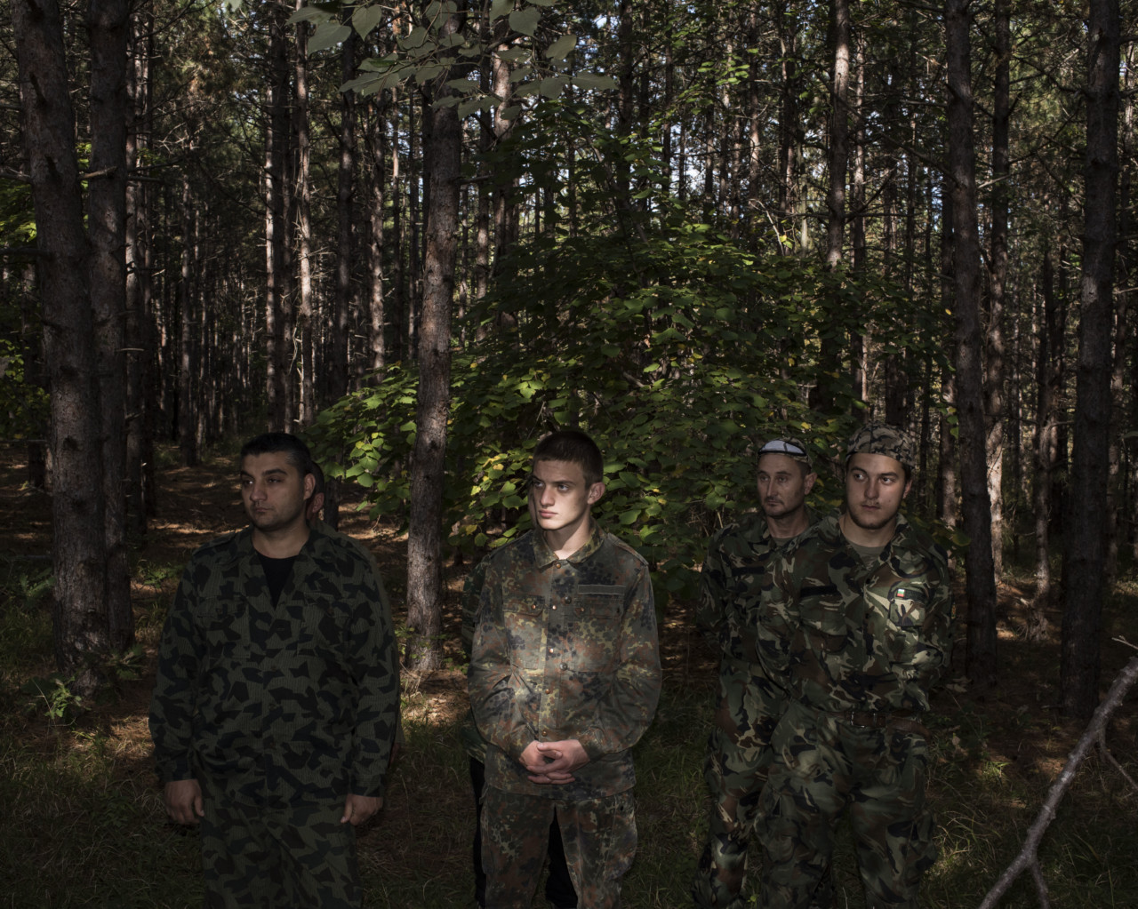 He photographed them and their Bulgarian counterparts doing army crawls, pushups and patrols as an officer’s puppy frolicked beside them in the woods. He also shot deserted facilities — a crumbling money exchange office, a gas station — along the border to “evoke the total permeability of these borders” where masked vigilantes now face off with weary migrants.