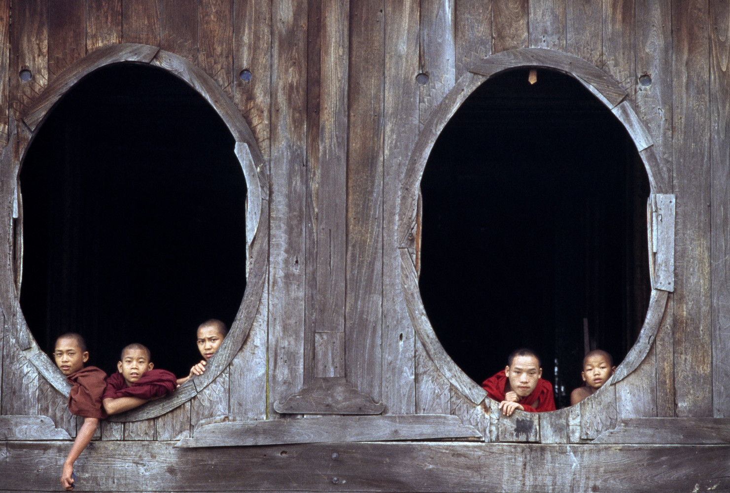 Chris Steele-Perkins Young Buddhist monks look out from their monastry near Inle Lake. Myanmar (Burma). 1995. © Chris Steele-Perkins | Magnum Photos