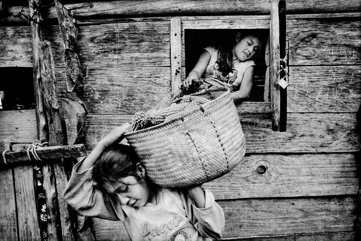 Sisters empty their family's corncrib. San Miguel Cuevas, Oaxaca, Mexico. 2008.